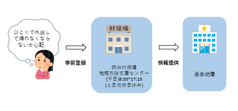 できるだけ早く発見・保護ができるように関係機関及び村内協力機関にご協力いただき、行方不明になった認知症高齢者等の早期発見・保護を目的とした取り組みです。
