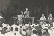1976年7月、読谷飛行場内で農耕をしていた農夫からの通報で、飛行場内にアメリカ軍が戦略通信アンテナ工事に着手していたことが村に知らされました。村は工事の中止要請を行い、この工事が楚辺通信所(ハンザタワー)に関するもので「海軍のP3C対戦哨戒機からの受信用アンテナ建設工事」であることをアメリカ軍から伝えられました。読谷飛行場の使用目的に反するアンテナ基地建設にたいして、読谷村長、村議会議長、読谷飛行場用地所有権回復地主会長は建設計画撤回要請電報を防衛施設庁長官、同施設部長宛てに打電し、那覇防衛施設局、県知事、県議会議長、嘉手納航空隊内在沖海軍司令部工務部長などの関係機関に建設撤回の要請、決議文の手渡しなどを精力的におこないました。アンテナ基地建設場所として「読谷飛行場ほど条件のそろったところはない」と、工事をすすめるアメリカ軍とそれを容認する日本政府の態度に、要請行動に限界を感じた村と地主会はついに座込みの実力闘争を決意したのです。10月6日、座喜味・波平・楚辺・大木・伊良皆・喜名の各集落からぞくぞくと地主たちが読谷飛行場に集まり、「これ以上の基地を読谷村には造らせない」・「完全撤去するまでは座込みを続けていく」ことを固く決意し、工事の作業を中止させたのです。しかし、アメリカ軍や防衛施設局は工事を断念するどころか、警察権力を借りてでもアンテナ基地を建設する構えにでてきたのです。地主会が33年余のあいだ訴えつづけた「所有権を返せ」の血の叫びまでも無残に押しつぶされそうな状態でした。権力によって村民の意志が圧殺され、基地反対闘争が挫折することを憂慮した村内の民主団体は「読谷飛行場用地所有権回復支援共闘会議」を結成、村内の婦人会・青年会など政治色のない広範な村民を結集しました。座込み闘争が18日目の10月23日「読谷飛行場内米軍アンテナ設置反対村民大会」が開催されました。横なぐりの雨のなか、参加者は雨ガッパ、長靴に身を固め「アンテナ設置断じて許さんぞ」「村民総結集してアンテナ建設を即時中止させよう」と村民無視のアメリカ軍のやりかたに激しい怒りをぶつけ、「反戦平和をめざし・基地の拡大強化を阻止・所有権の回復をかちとろう」など、三つのスローガンを満場一致で採択しました。その上空には時折アメリカ軍のヘリコプターが飛びかい大会の状況を偵察していましたが、降りしきる雨のなか大会参加者はたじろぎもしないでこぶしを空にむかって振り上げたのです。村民の団結力で工事は中断していましたが、それでも那覇防衛施設局は工事再開を目論み、阻止闘争に対し機動隊の導入を要請していました。村民は県内の民主団体に支援を要請し体制を拡大、山内徳信村長(当時)は直接アメリカ大統領に直訴しました。カーター大統領への直訴状は県内外のマスコミ紙上に大きく取り上げられ、外交問題にまで発展しかねない大きな問題となりました。 |